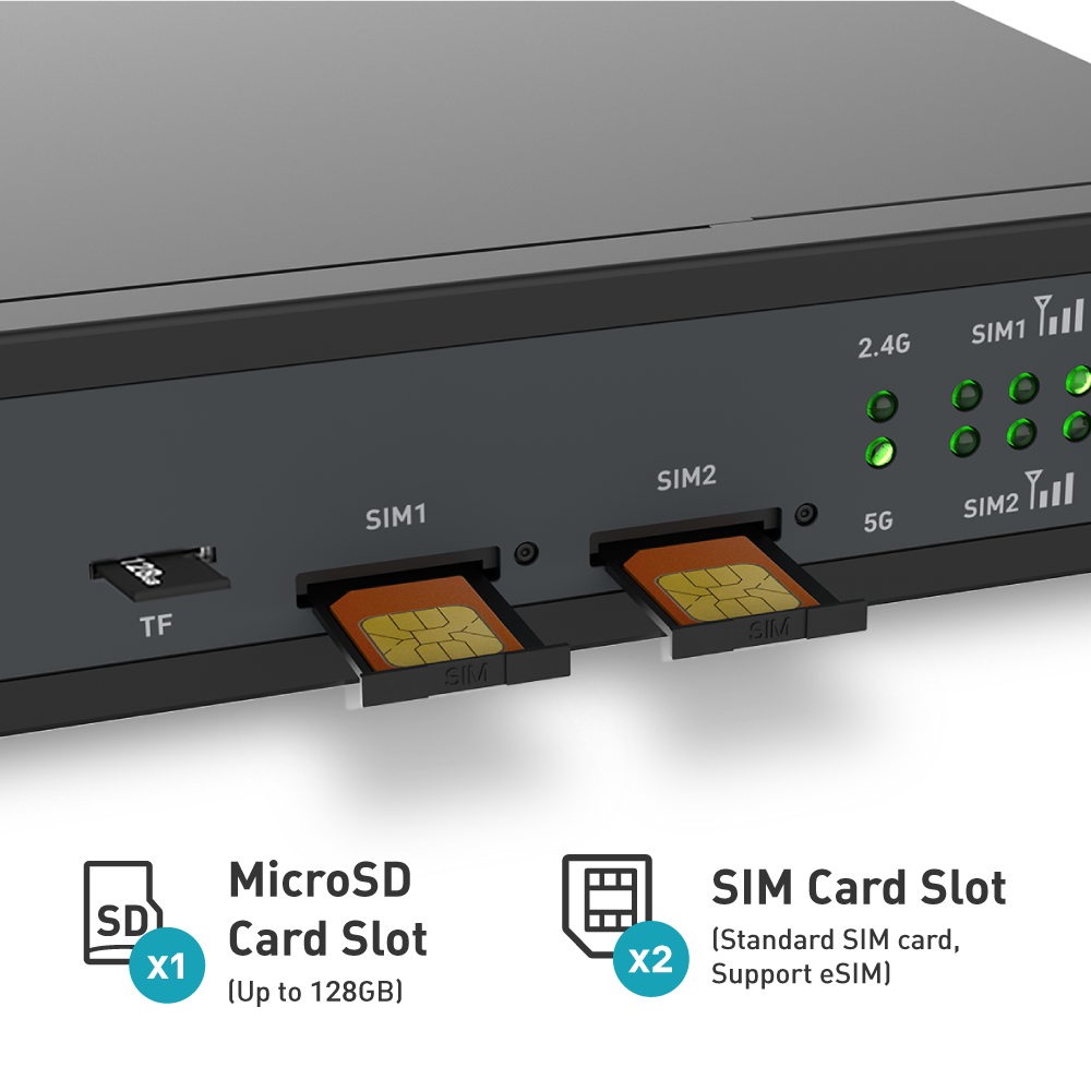 • Enterprise-Grade Standard Hardware: 2 x CAT4/6 LTE modules, 2 x SIM card slots, 1 x TF card slot, 1 x USB2.0 port, PoE, 5 x Gigabit ports