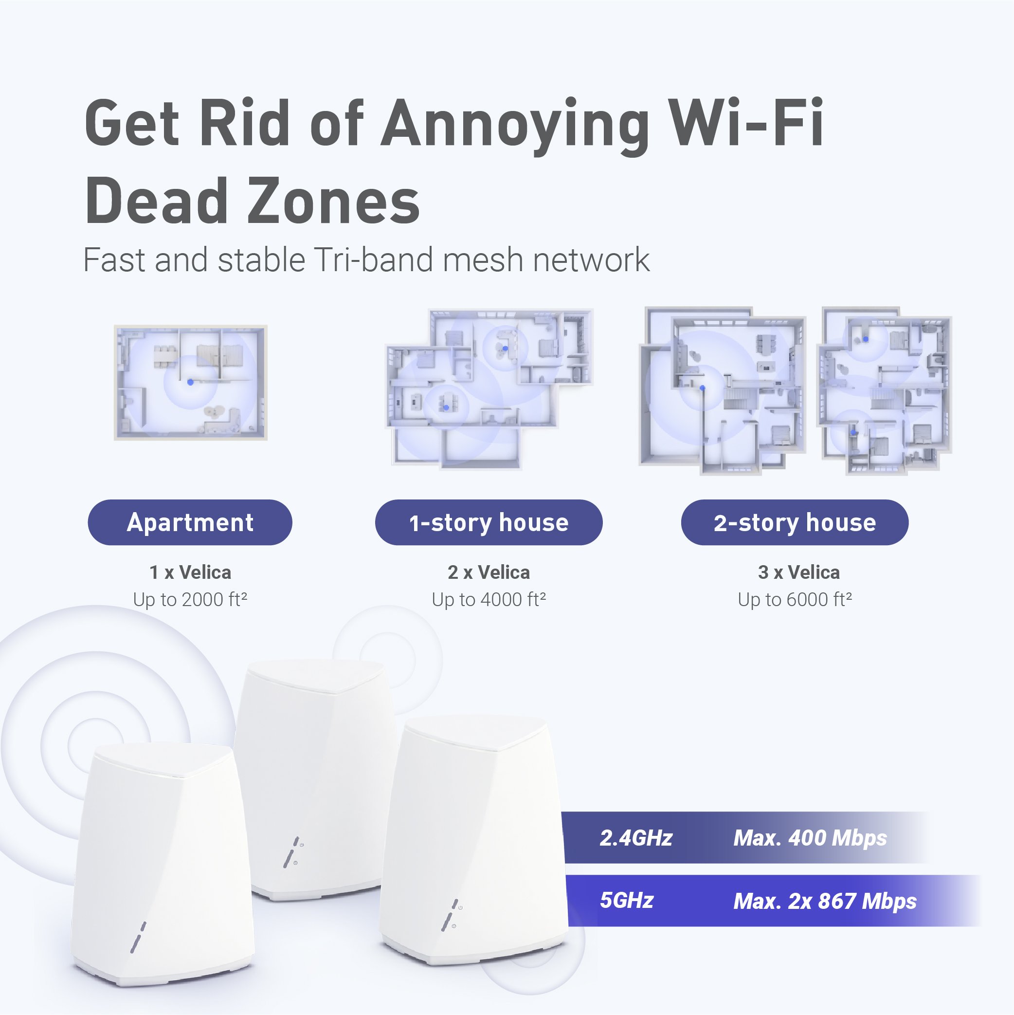 Tri-band Mesh WiFi: Tri-band WiFi with quick speed up to 400Mbps (2.4GHz) + 2x867Mbps (5GHz). Designed for houses to eliminate any WiFi dead zones. Multiple devices are required to extend the WiFi network.