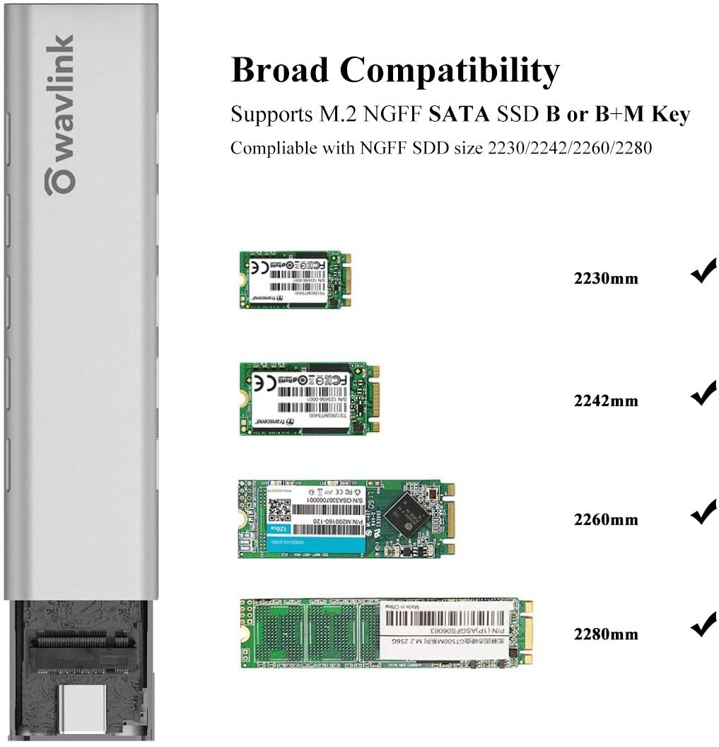 - What We Offer: 1 x Wavlink USB-C NGFF M.2 SATA External SSD Enclosure Case;1x USB C to USB 3.0 cable;1x USB C to USB A Convertor;1 x Screw driver; 1 x Instruction manual; 1-year warranty, 30 days money back,24h friendly customer service and email support.