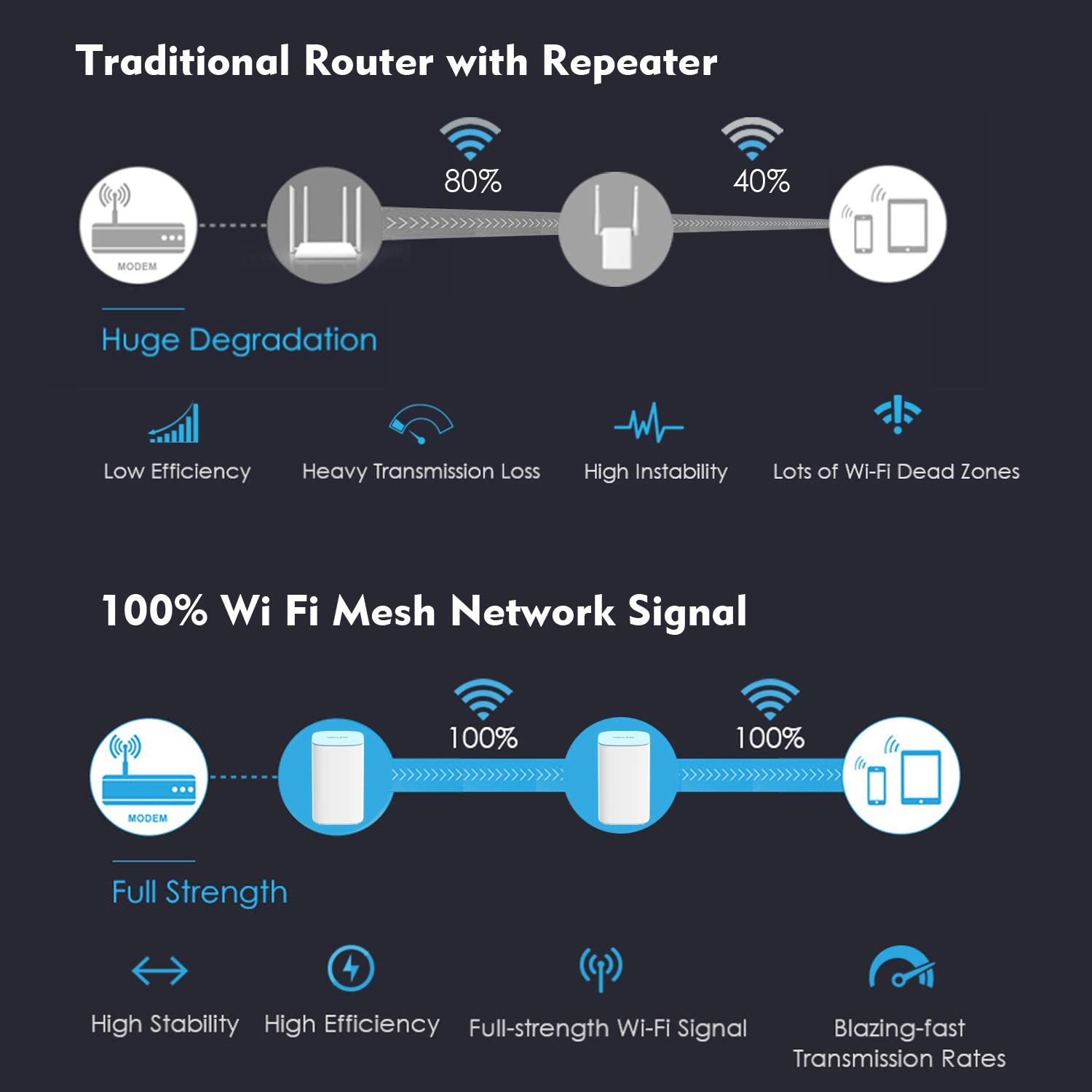 • 【Whole Home Mesh WiFi System】 Seamless Roaming, automatic networking, easily fill the whole house with WiFi coverage.Powerful Tri-Band Mesh WiFi System distributes 100% Internet speed to the edge of your WiFi network at home, without signal degradation when the end device is moving around
