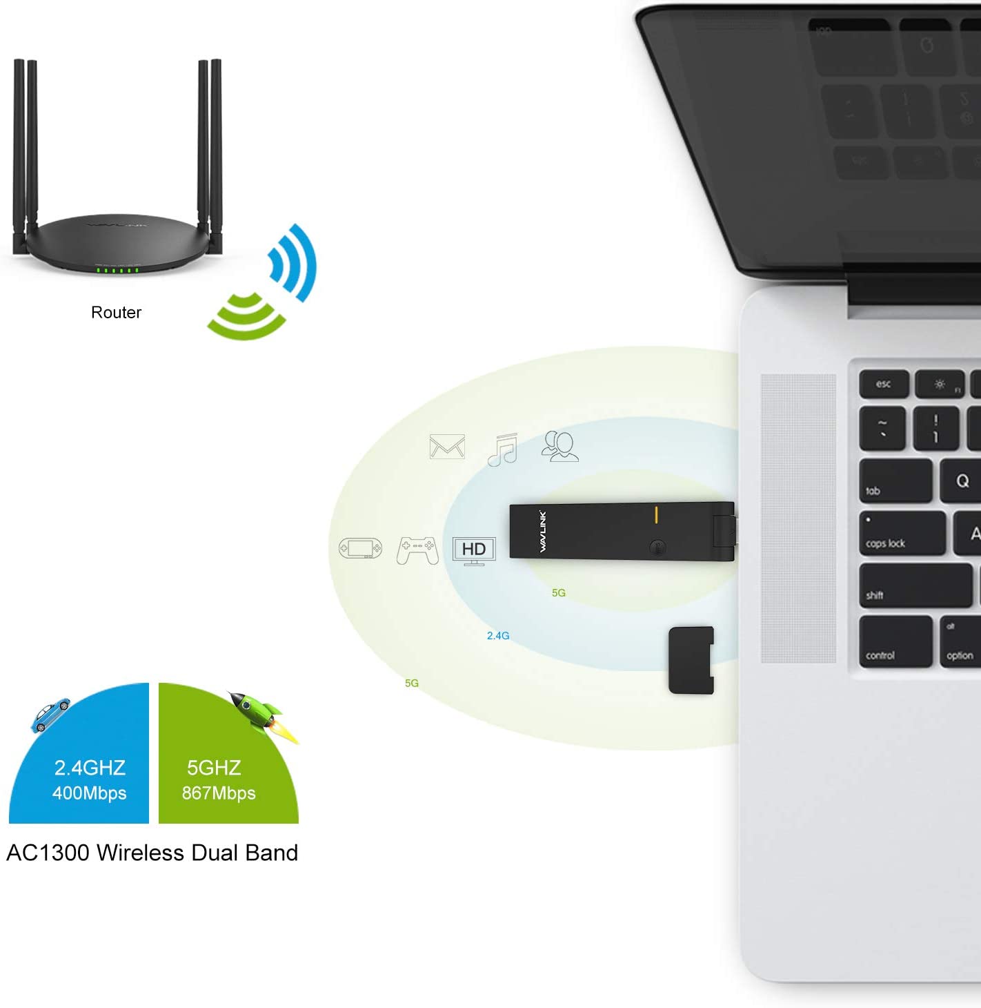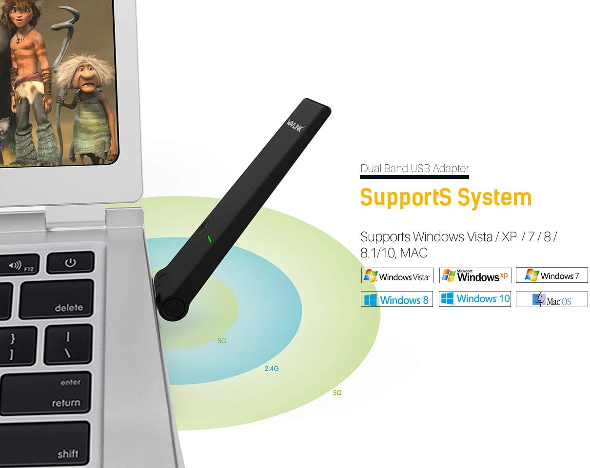 - AC1300 Dual Band Wi-Fi adapter – Wireless usb adapter up to 1300Mbps Wi-Fi speeds 5GHz 867Mbps and 2.4GHz 400Mbps, Dual Band provide flexible connectivity, it helps you stream Ultra HD video without buffering, play online games without lag ,download large files in seconds.